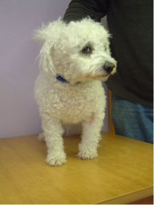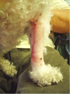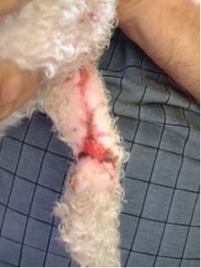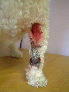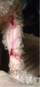 Busby was presented to my clinic as an out of hour’s patient, just three days after his original treatment, as the owner was concerned about the worsening odour from the bandaged leg. He had contacted the original veterinary referral centre for permission to attend us as he had been a patient with us previously. Although bright at the time of presentation, Busby’s bandage was emitting a foetid odour and with evidence of pain as the bandage was gently removed. The lower limb unexpectedly was not painful for the patient and the finding of some grit in the very thick coat that Busby being a bichon frise had indicated that the suspected damage to the lower digits on x-ray was in fact an artefact from the material left in the thick coat from the ground during the accident. Based on the initial description and the owner’s observation, no healing appeared to have taken place, and the purulent discharge matted the hair beyond the border of the wound.