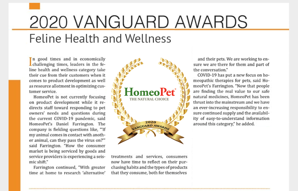 We are very proud to have recently received a 2020 Vanguard Award in the Feline Health and Wellness Category. The Vanguard Awards are presented each year by Pet Insight Awards to spotlight a select group of manufacturers that are driving growth with innovative, relevant and solutions-based products that provide genuine benefits to pets and their owners.
