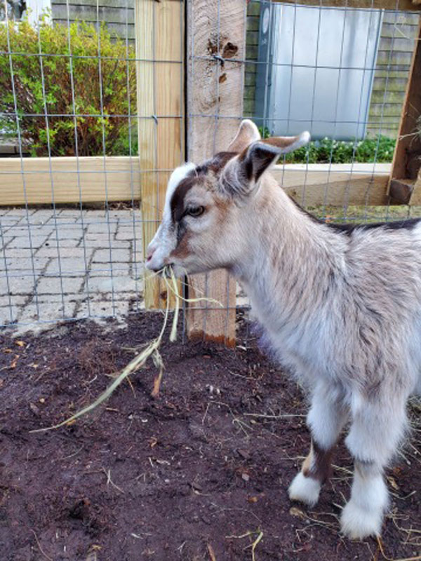 Young goats should receive milk every day until they’re about 12 weeks old. Molly and Hank also get some goat feed mixed with cracked corn as a little treat and they like to eat things like banana peels, cheerios, and veggies! So, they’re handy chaps to have around to minimize food waste.