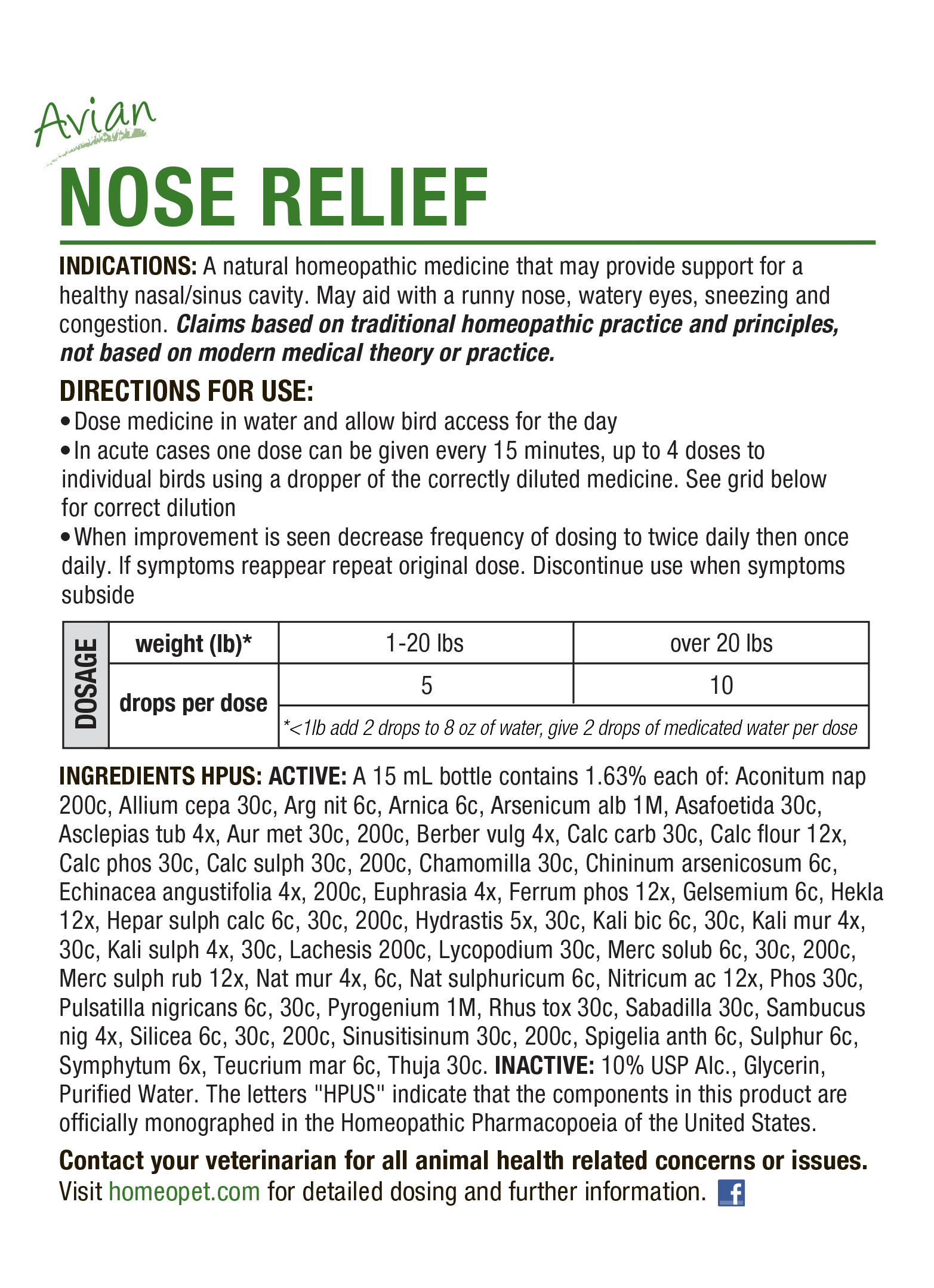 Veterinary-formulated with high-quality homeopathic ingredients, Avian NOSE RELIEF is available without a prescription and is great value for money, making it your natural choice to support your birds’ respiratory health. Its liquid format makes dosing simple and easy and it is safe for birds of all types and ages, including chicks, pullets and layers.Â