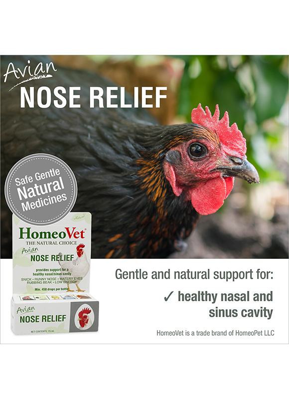 A natural remedy that may help provide support for certain nasal/sinus cavity issues in chickens, other poultry and pet birds. This safe and gentle remedy may aid with issues such as snick, runny nose, watery eyes, sneezing, congestion, rubbing beak and low energy.