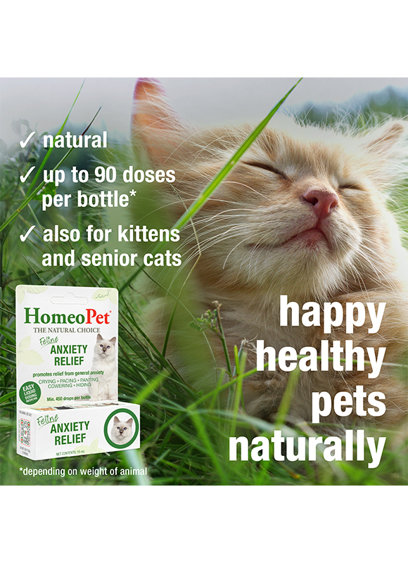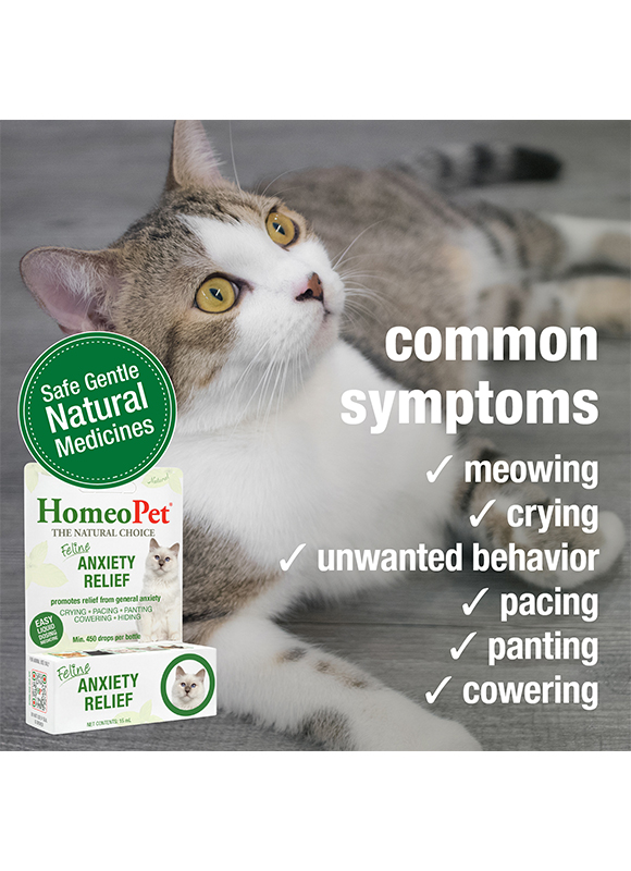 A natural remedy that may help promote relief from fear and anxiety in cats, such as that related to vet and grooming visits, a new pet or new baby in the household, or separation from familiar surroundings caused by a house move or cattery and boarding stays. This safe, gentle and natural stress calming aid for anxious cats may help provide relief from the symptoms of anxiety such as meowing, crying, pacing, panting, cowering, hiding, spraying, urine marking, or other unwanted behaviors.Â