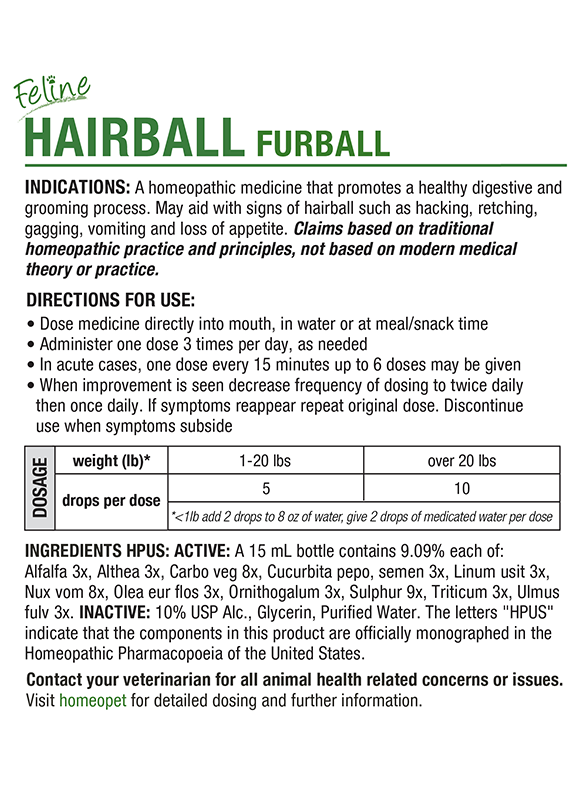 A veterinarian-formulated liquid remedy that may help promote a healthy digestive and grooming process in cats. This natural treatment may help reduce the discomfort caused by hairballs/furballs and their symptoms, including hacking, retching, gagging, vomiting, and loss of appetite.Â