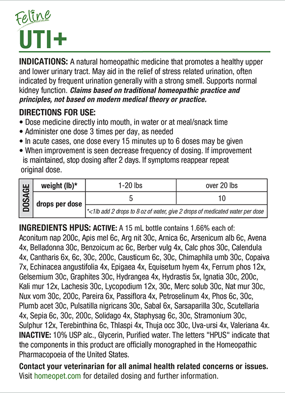 The UTI+ was a God send when Tigi started having issues trying to pee. I feared stones, as my Hobi passed on due to his complications. When Tigi started showing signs I Checked with 2 dif vets over the phone n my vet who all wanted visit $$$ upfront n told I needed to bring him immediately that if not he would most likely die. As he was impossible to rangle and get to a vet, I found these online. I followed the steps and it cleared up. Every once in a while I add a few drops in his food as a preventative. No problems since.