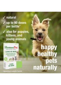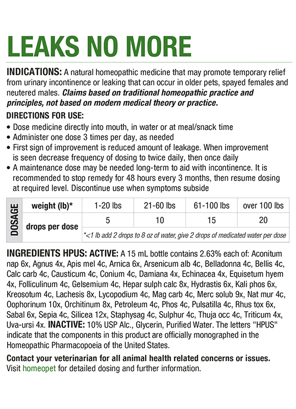 HomeoPet LEAKS NO MORE is a safe, gentle, and veterinarian-formulated liquid remedy that may help provide temporary relief from urinary incontinence in pets. Ideal for older animals, spayed females, and neutered males, this high-quality homeopathic formula may help address common symptoms such as leaking during sleep, constant dribbling, or unexpected puddles and stains around the home.