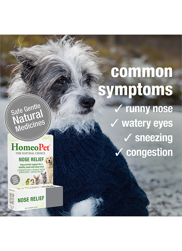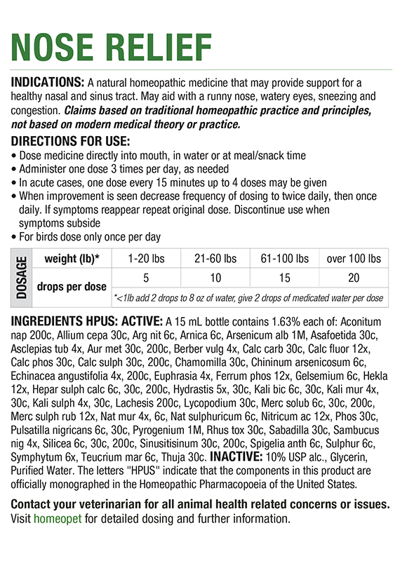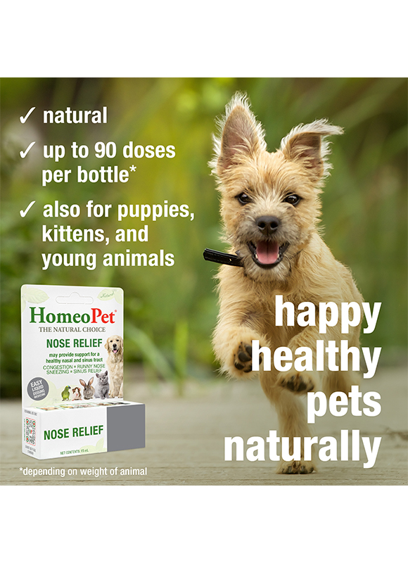 HomeoPet NOSE RELIEF remedy may naturally and safely help support certain nasal and sinus tract issues in pets, including dogs, cats, puppies, kittens, and other small animals. This easy-to-administer natural remedy may help alleviate symptoms such as runny nose, watery eyes, sneezing, and congestion.
