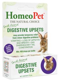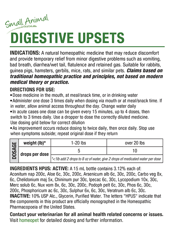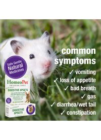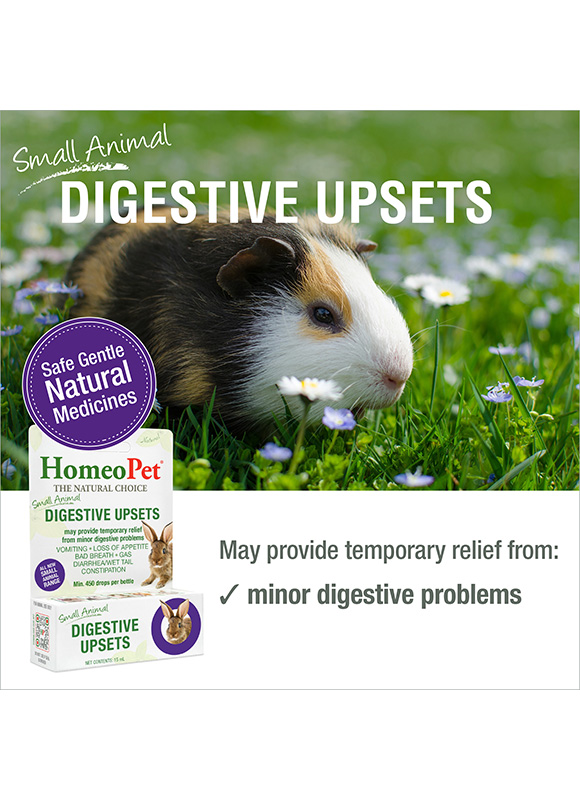 New from HomeoPet, this natural medicine is specifically formulated to provide safe and gentle relief for common digestive issues in small animals, including hamsters, gerbils, rabbits, guinea pigs, chinchillas, ferrets, and mice. DIGESTIVE UPSETS for Small Animals may help provide temporary relief from minor digestive problems such as vomiting, loss of appetite, bad breath, gas, diarrhea/wet tail, and constipation.