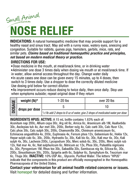 Made with high-quality homeopathic ingredients, NOSE RELIEF for Small Animals is suitable for small pets of all ages – from young to senior animals. Safe and gentle, this natural treatment is specially designed for the unique needs of small animal companions, helping you provide the safe and gentle support to even the tiniest of animal companions.