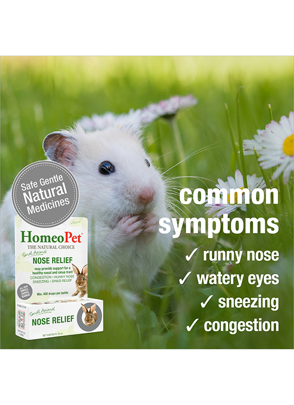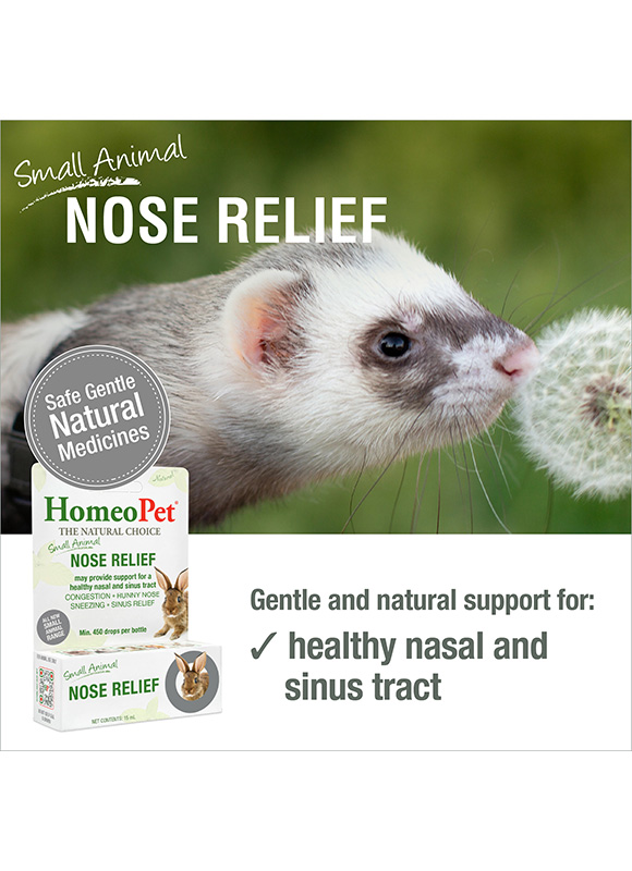 New from HomeoPet, this award-winning natural medicine is specifically formulated to provide safe, gentle support for a healthy nasal and sinus tract in small animals, including hamsters, gerbils, rabbits, guinea pigs, chinchillas, ferrets, and mice. NOSE RELIEF for Small Animals may help provide temporary relief from minor respiratory symptoms such as congestion, runny nose, sneezing, discharge, nasal irritation, and sinus discomfort.