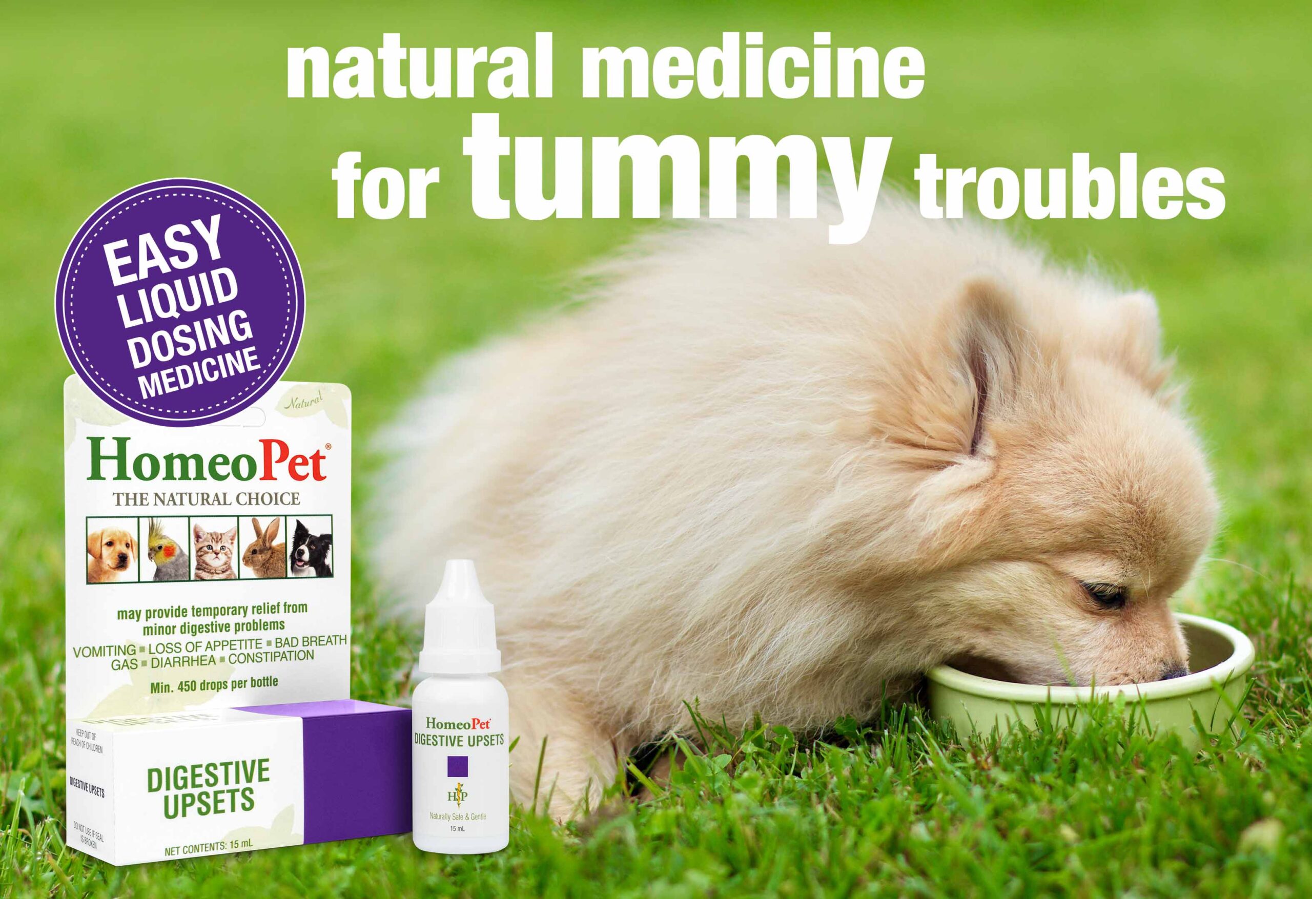 - HomeoPet Digestive Upsets: A natural medicine specifically formulated to help with common digestive issues in dogs and other pets, such as vomiting, diarrhoea, and gas. Containing a natural blend of quality ingredients that help support digestive health, Digestive Upsets is safe to use on its own and with both natural and conventional digestive aids. Think of it as a holistic first aid kit for your dog’s digestive woes.