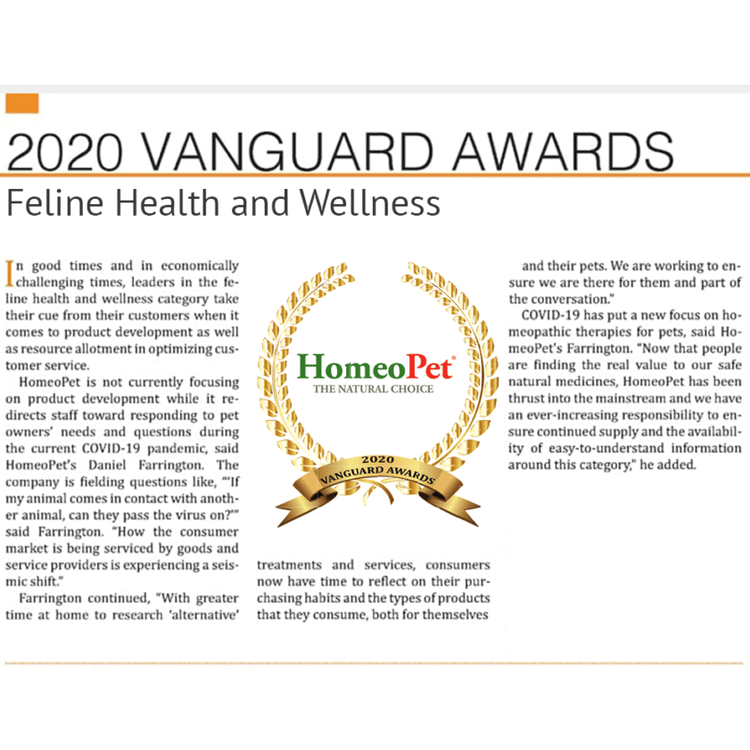 We are very proud to have recently received a 2020 Vanguard Award in the Feline Health and Wellness Category. The Vanguard Awards are presented each year by Pet Insight Awards to spotlight a select group of manufacturers that are driving growth with innovative, relevant and solutions-based products that provide genuine benefits to pets and their owners.