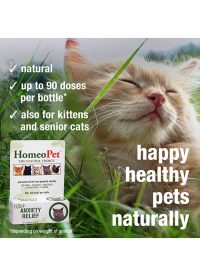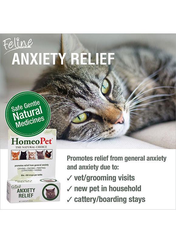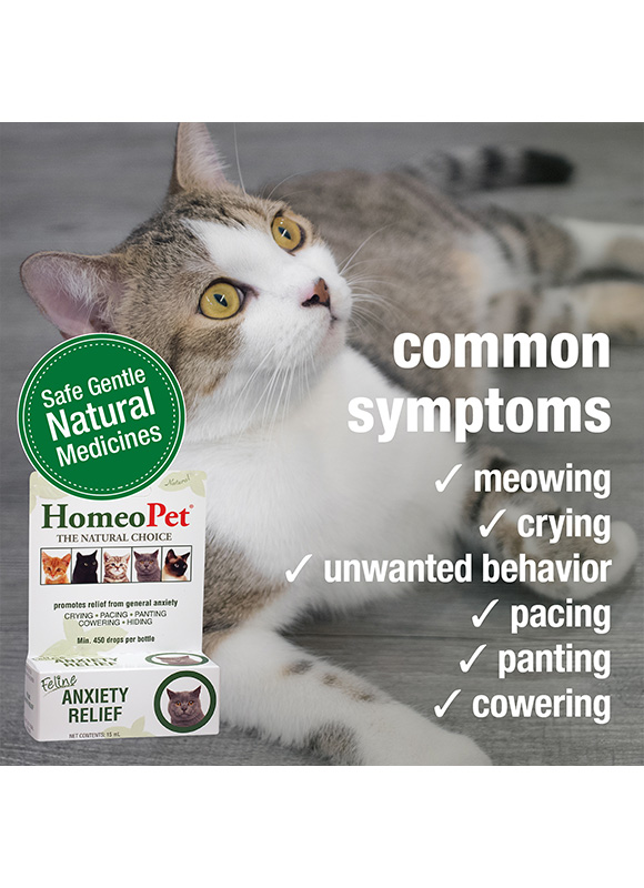 Stress and anxiety support for cats – HomeoPet Feline Anxiety Relief medicine may help promote relief from fear and anxiety in cats related to vet and grooming visits, a new pet or new baby in the household, and separation from familiar surroundings caused by a house move or cattery and boarding stays. This safe and gentle stress calming aid may help provide relief from the symptoms of anxiety such as meowing, crying, pacing, panting, cowering, or other unwanted behaviour.