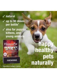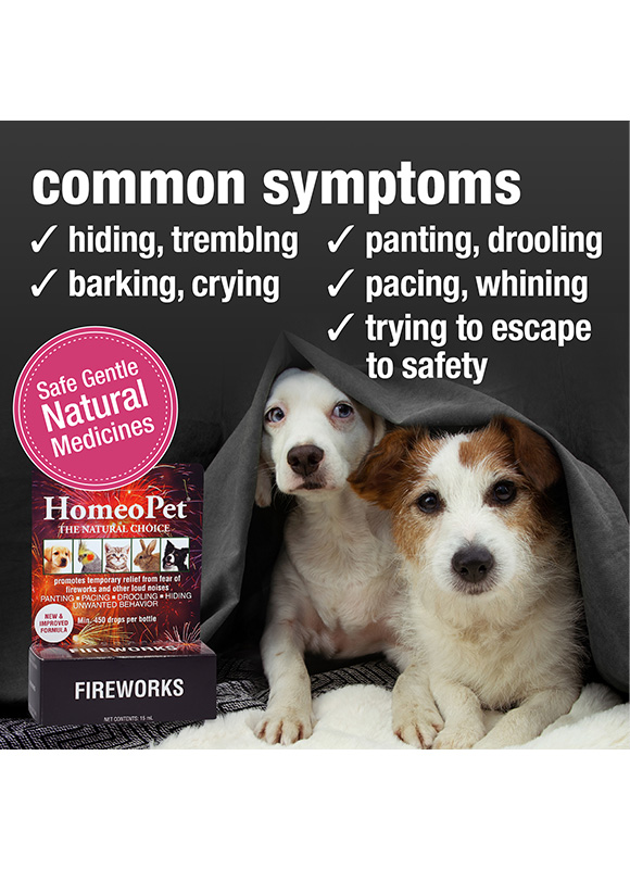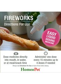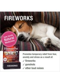 INDICATIONS:Â A natural homeopathic remedy that may help promote temporary relief from fear of fireworks, gunshots and loud noises normally associated with signs such as hiding, barking, attention seeking, pacing and panting, drooling, trembling, trying to escape to safety.